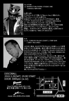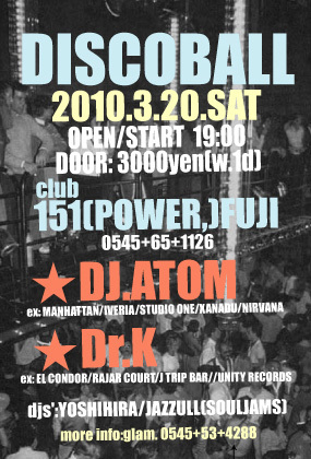 管理人様 いつもお世話になっております。 イベント告知です。 宜しくお願いいたします。 +++++++++++++++++++++++++ 「DISCOBALL」 待望。2年ぶりの開催です。 万障繰り合わせのうえ大集合下さい。 DISCOBALL 3/20(sat) OPEN/START 19:00 DOOR:\3000(w.1d) club151(club POWER),FUJI djs' ★DJ.ATOM (ex:MANHATTAN/IVERIA/STUDIO ONE/XANADU/NIRVANA) ★Dr.K (ex:EL CONDOR/RAJAR COURT/J TRIP BAR//UNITY RECORDS) 30年以上にも渡り"KING OF DISCO DJ”として君臨し続けるDJ ATOM氏、 またトーキョーのハウス