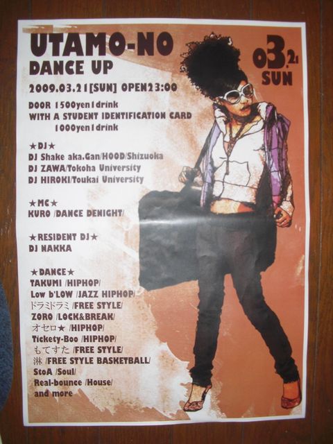 管理人様、告知失礼致します。 『UTAMO〜NO dance up↑』 3/21(日・祝日前) 23:00 OPEN @ETTI DOOR 1500YEN 1D (学生は学生証提示で1000YEN 1D) ☆DJ☆ DJ Shake aka.Gan/Hood DJ ZAWA/常葉大3年 DJ HIROKI/東海大2年 ☆DANCE☆ TAKUMI/HIPHOP/金谷/一般 Low b'Low/JAZZ HIPHOP/静岡大2年 ドラミドラミ/FREE STYLE/焼津・静岡/一般 ZORO/LOCK&BREAK/常葉大3年 オセロ★/HIPHOP/県立大2年 Tickety-Boo/HipHop/静岡大1年 もてすた/FreeStyle/沼津/一般 StoA/SOUL/静岡/一般 Real-bounce/House/静岡/一般 orbis/Fre