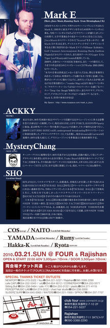 管理人様、告知失礼致します。 不適切でしたらお手数ですが削除お願い致します。 ※※※※※※※※※※※※※※※※※※※※※※※※※※※※※※ 2010.3.21(sun) HOUSENATION meets Luv&Dub Paradise @Rajishan & FOUR Open/22:00 Adv/\3,000(1d) Door/\3,500(1d) DJs @FOUR Mark E (Merc,Running Back/from Birmingham, UK) ACKKY(BANK!) MysteryChang(NITE LITE) Hakka-K(Luv&Dub Paradise since1991) @Rajishan DJ SHO(Luv&Dub Himeji) NAITO(Luv&Dub Shizuoka) COS(p.u.g) YAMADA(Luv&Du