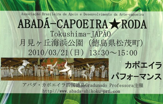 ABADÁ-CAPOEIRA RODA Tokushima-JAPÃO カポエイラ・パフォーマンス 2010年3月21日(日) 13:30〜15:00 会場 月見ヶ丘海浜公園 (徳島県板野郡松茂町豊岡字山ノ手) 雨天時は四国大学にて カポエイラとは、約400年の歴史がある、アフリカ起源のブラジル伝統文化です。左右に揺れながら蹴ったりよけたり、更にアクロバットな技を繰りだし、プロセスを楽しみながらゲームをします。歌や楽器を奏でながら人々の輪の中でゲームをするという世界的にも珍しい形式で行われ、アフロ・ブラジル文化のひとつとして世界で楽しまれて