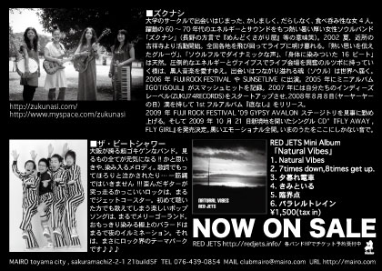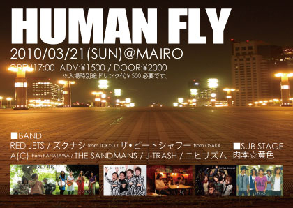 今年初の自主企画『HUMAN FLY』が来週に差し迫ってます 今回のゲストは2組 去年のFUJI ROCK FESTIVAL '09 GYPSY AVALONステージのトリを見事に勤め上げたガールズバンド“ズクナシ”が念願かなってついに『HUMAN FLY』に初登場おまけに富山で初ライブみたい グルーヴィーでソウルフルなライブにぜひ期待してくださいね そして、去年あたりからすっごい仲良くさせてもらってる大阪の超ゴキゲンバンド、自称ロック界のテーマパーク“ザ・ビートシャワー”が新しい音源を引っ提げて再び『HUMAN FLY』に登場