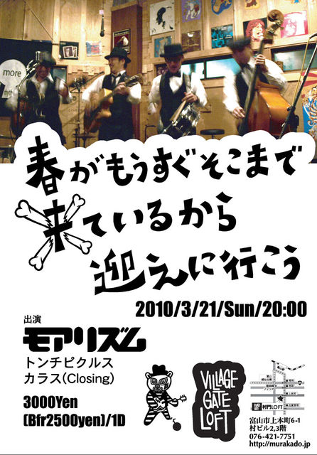 告知失礼致します ただいま絶好調 アルバム制作中のモアリズムさん 来県です!! 今回はトンチピクルスさんを連れてのライブです 乞うご期待!! <出演> モアリズム・トンチピクルス・カラス <日時>2010年3月21日(日) 開場20:00〜 <会場>ヴィレッジゲート・LOFT(富山市上本町6-1 村ビル3階 ) <料金> 前売¥2,500/1ドリンク付(当日¥3000/1ドリンク付) <お問い合わせ>076-421-7751