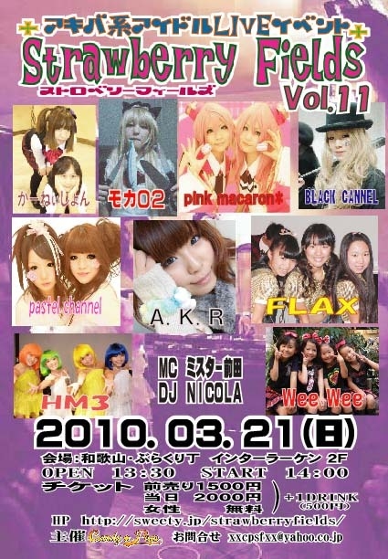 知り合いさんが主催しているライブで,この場所を借りて告知させていただきます. アキバ系アイドルLIVEイベント Strawberry Fields 〜ストロベリーフィールズ〜 vol.11 公式サイト: http://www.candypop.info/strawberryfields/ 和歌山唯一のメイドカフェ「CANDY★POP cafe」が発信するアイドルLIVEイベント毎月開催中!! 関西を中心に活動中の地下アイドル&メイドによる歌とダンスのアニソンライブイベント!! 日時:2010年3月21日(日) OPEN 13:30・START 14:00 会場:和歌山・ぶらくり丁 インターラーケン2F(アクセス) http://www