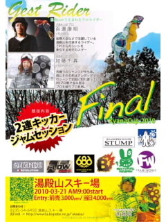 2連キッカーによるJAM セッション 一年の集大成、Tryしたい人、イベントの雰囲気を味わいたい人とにかく雪が大好きな人、参加してみましょう エントリ-費 事前 3000円 当日 4000円 3月20日まで事前扱いです。 エントリー用紙はスキー場の事務所にあります。 FAXでも受け付けます。 直接持ってきた方は事務所、もしくは僕に出してください。 もちろん決勝はかなりのハイスキルが予想されます。 出場される方もちろん大歓迎ですが観戦される方も大歓迎。 ビール片手に見るもよし 友達の応援