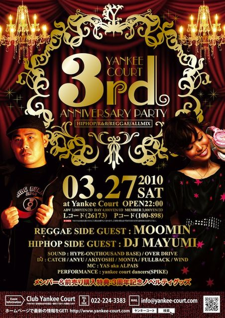 今月二本目は、先月リリースされたMIX CD『XXX -If You Came Here-』が爆発的ヒットを記録中のNo.1 girls DJ【DJ KYOKO】と、初のフルアルバムもリリース間近、DEXPISTOLS率いるROC TRAX CREWの若手筆頭のTSUBAME&MASAYASUの2人によるDJ Bandユニット【MYSS】の二組をゲストに迎え開催!!!!!