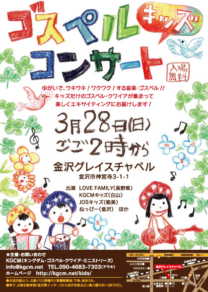 初の試み!?キッズだけのコンサート! 出演者も司会も、ぜ〜んぶ子ども達 粟野めぐみがプロデュースしているLove Family Choir改めLOVE FAMILY(長野県)とKGCMキッズ(石川県)が合同で主催。他にもいろんなところで活動しているお友達も集まってくるよ〜長野からはゴスペルバンドもやってくる〜♪Oh!楽しみ〜 出演*LOVE FAMILY KGCMキッズ JOSキッズ ねっぴー ほか 【入場無料】 お問い合わせはKGCM(キングダム・ゴスペル・クワイア・ミニストリーズ) http://kgcm.net/ E-mail info@kgc