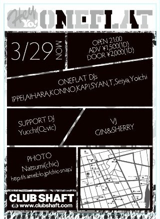 「ONEFLAT」 3/29(Mon) OPEN21:00〜 @CLUBSHAFT ADV \1500(1D) DOOR \2000(1D) GUEST DJs/ D.O.I(BIRTHDAY) YOSHIDA(KING RASTA) DJ HASHIMOTO(BOUNTY×HUNTER) WARUNORI DJ's SUPPORT DJ/ Yucchi(Q-vic) ONEFLAT DJs/ IPPEI AIHARA KONNO KAP! Syan T Seiya Y VJ/ GIN&SHERRY Photo/ Natsumi(chic) 今年1発目のワンフラです。是非!