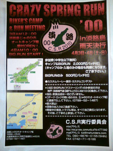 ※【旅館の紹介】 『やしま旅館』 http://www1.sumoto.gr.jp/yashima/ 場所:〒656-0011 兵庫県洲本市炬口(タケノクチ)247 {淡路島でウロウロしてますので発見したら気軽に声をかけてください} 一休一瞬一定一刻一発一杯一緒一生一見一徹一服一品一挙一泊 ※【イベントの御知らせ】 『CRAZY SPRING RUN』 開催場所、4月3日(土曜日)開場時間未定宿泊前夜祭 兵庫県南淡路市じゃのひれオートキャンプ場(予定) 4月4日(日曜日)じゃのひれキャンプ場STARTCSRツーリング
