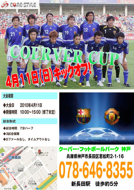 みなさん、日々の業務お疲れ様です。 今週の日曜日、コアスタイルフットサル部の久々の大会をやります! 新卒メンバーも加入し、そろそろ弱小サッカー部の汚名を返上と行きましょう 場所:クーバーフットサルパーク神戸(新長田駅から徒歩2分) 住所:〒653-0038 兵庫県神戸市長田区若松町2-1-16 TEL:078-646-8355 FAX:078-646-8354 mail:kobe@coerver-footballpark.com HP⇒http://www.coerver-footballpark.com/kobe/access/ 地図⇒http://map.yahoo.co.jp/pl?p=%CA%BC%B8%CB%B8%A9%BF%C0%B8%CD%BB%D4%C4%B9%C5%C4%B6%E8%