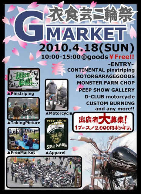 JOINTSの翌週に兵庫県伊丹市にあるMOTOR GAREGE GOODSさんがお店の前でイベントやります!! そこにD-CLUBも参戦決定☆ D-CLUBは中古パーツのフリーマーケット&カスタムバイクの展示を予定しておりますっ その他にも、カスタムバーニングの撮影会やコンチネンタルさんによるピンスト実演オーダー受付、来場車輌のカスタムコンテストなどなど・・・ 魅力いっぱいのイベントです 時間は AM10:00〜PM3:00 詳細はGOODSさんHPにて!! http://www.mggoods.com/aaa/menu/g-market.htm MOTOR GAREGE GOODS 兵庫県伊丹市森本5-3