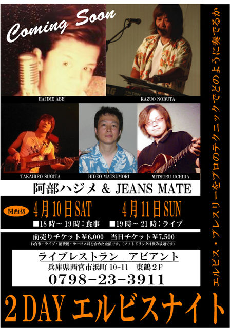 東京では毎回大好評を博している ELVIS NIGHT いよいよ関西上陸です ハジメちゃんの素敵な歌声、 ブルージーンズのメンバーの信田さん、松森さん、杉田さんのテクニック、 そして、内田さんの素晴らしいギター 元六甲山ホテルセクションシェフが作るイタリアンフレンチ料理を堪能しながら 素敵な夜を過ごしましょう 4月10日 SAT &