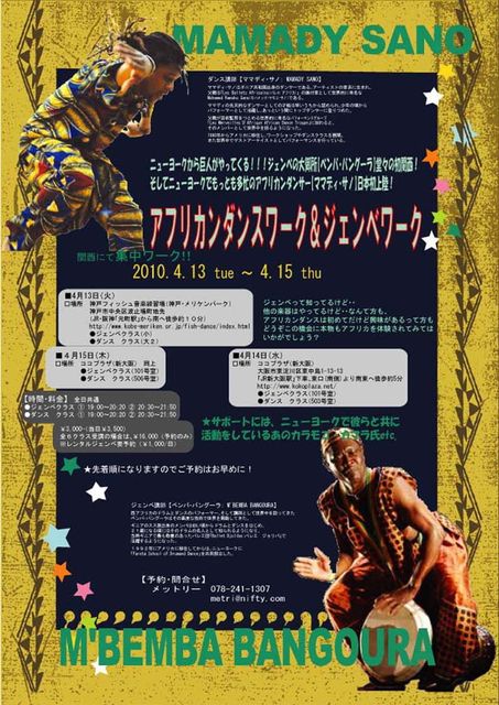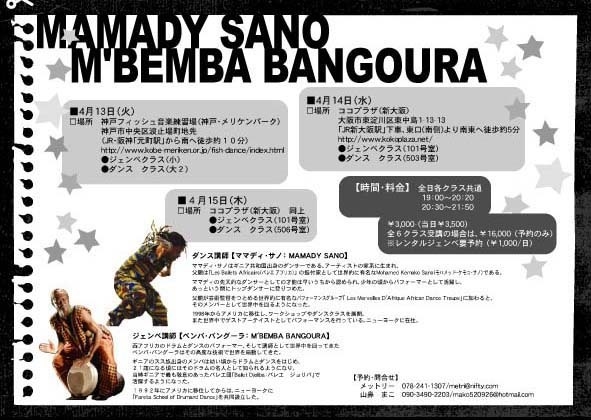 ニューヨークから来日決定! 【ベンバ・バングーラ & ママディ・サノ 3日間 関西集中ワーク!】 ジェンベの大御所『M`BEMBA BANGOURA/ベンバ・バングーラ』 ギニアの国立舞踏団『ジョリバ』出身、YoussoufのDVD『 WONGAI』で ソロを叩いているジェンベマスター。 そして、超多忙なアフリカンダンサー『MAMADY・SANO/ママディ・サノ』 ★サポートドラマーは、彼らとニューヨークで活動を共にしている『カラモコ・カマラ』など豪華アフリカ(ギニア)人 ・karamoko camara (カラモコ・カマラ) ・abou kem