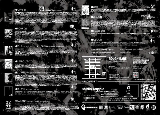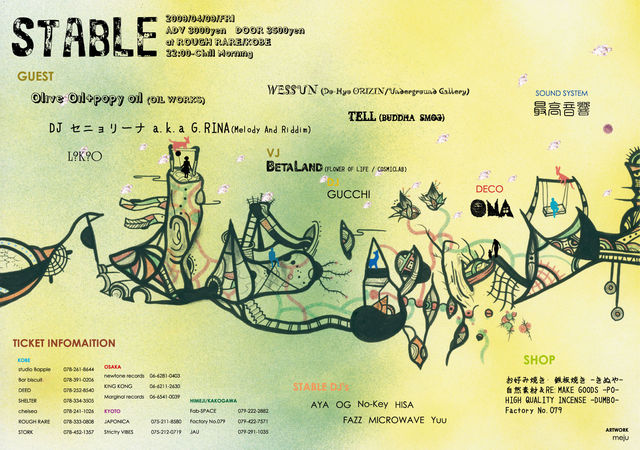 管理人様告知失礼致します。 □□□□□□□□□□□□□□□□□ STABLE vol.03 春 2009/04/09/FRI ADV 3000yen DOOR 3500yen @神戸ROUGH RARE (HP:http://www.roughrare.com/) ●GUEST popy oil+Olive Oil(OILWORKS) DJセニョリーナ L?k?O WESSUN(土俵ORIZIN/Underground Gallery) ●STABLE DJ's http://www.myspace.com/stablekobe AYA OG No-Key HISA FAZZ MICROWAVE Yuu ●VJ BetaLand (FLOWER OF LIFE / COSMICLAB) ●DECO ONA ●SOUND SYSTEM 最高音響