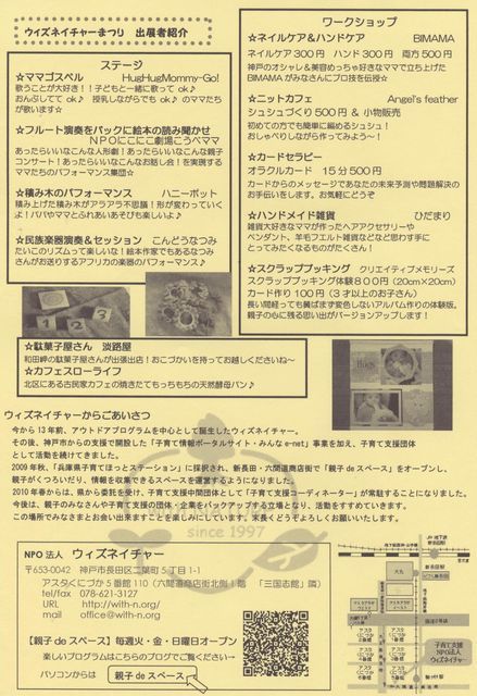 告知失礼致します 自然を通しての様々なプログラムの展開と子育て支援の活動をしている 神戸市長田区”ウィズネイチャー”さんが、新長田六間道商店街で 子育て世代の方々に利用していただけるスペースをオープンします。 オープンを記念して開催されるおまつりステージで、 私たちゴスペルクアイア”Hug Hug Mommy-Go!”がライブをさせていただきます 日時:4月4日(日曜日)11時〜11時30分 場所:親子deスペースウィズネイチャー(http://www.with-n.org/) 六間道商店街内 新長田アスタくに