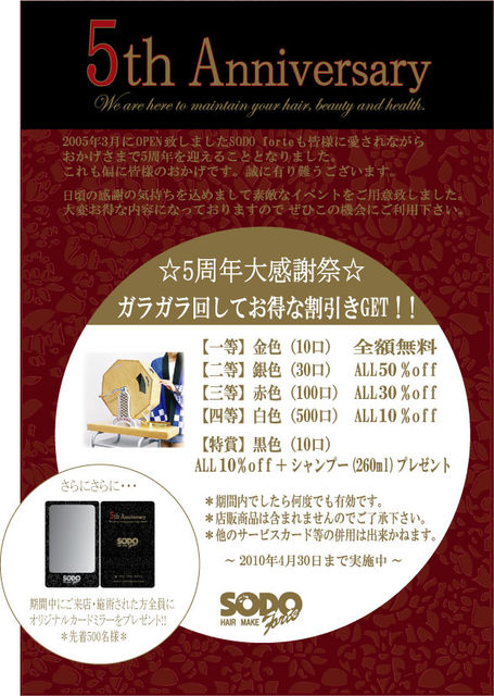 2005年にOPEN致しましたSODOforteも皆様に愛されながら おかげさまで5周年を迎えることとなりました。 これも偏に皆様方のおかげです。誠に有難うございます。 日頃の感謝の気持ちを込めまして、とっても素敵なイベントをご用意致しました! 大変お得な内容になっておりますので、是非この機会にご利用ください!! ======================================= ☆★ガラガラ回してお得な割引きGET!!★☆ 【1等】金色(10口) … 全額無料!! 【2等】銀色(30口) … ALL50%off!! 【3等】赤色
