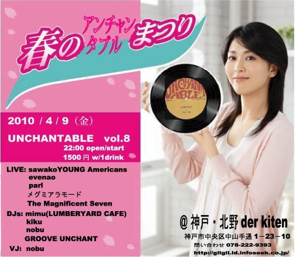 2010/4/9(金) UNCHANTABLE vol.8 「春のアンチャンタブルまつり」 なんかしらずっとブースにいるだろう LIVE:sawakoYOUNG Americans evenao parl メグミアラモード The Magnificent Seven DJs: mimu(LUMBERYARD CAFE) kiku nobu GROOVE UNCHANT VJ: nobu 1500円 w/1drink 22:00 open/start @神戸・北野der kiten 神戸市中央区中山手通1−23−10 問い合わせ078-222-9393 http://gilgil.ld.infoseek.co.jp/
