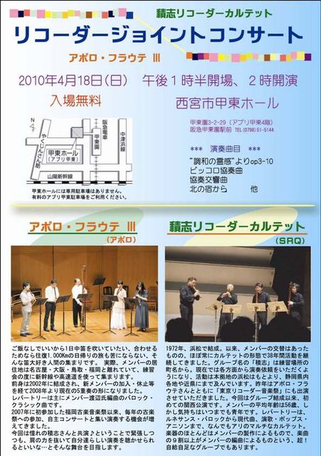 日 時:2010年4月18日(日) 午後2時開演(午後1時半開場) 場 所:兵庫県西宮市甲東ホール 甲東園3-2-29(アプリ甲東4階) 阪急今津線甲東園駅前すぐ 0798-51-5144 入場料:無料 曲 目:調和の霊感op.3-10、ピッコロ協奏曲、協奏交響曲、北の宿から、 その他多数 出 演:積志リコーダーカルテット、アポロフラウテIII 〜〜〜〜〜〜〜〜 この度、4月18日(日)に開くことになりましたリコーダージョイントコンサートのお知ら