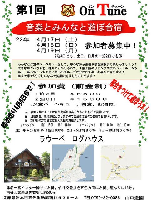 1.4月17日(土曜日)〜4月19日(月曜日)、 土日の一泊二日でも、 日月の一泊二日でも、 もちろん、二泊三日でもオッケーオッケーです^^ 2.ここのログハウス、ミタイナ http://lauhbe.web.fc2.com/ 3.詳細は、オンチューンのホムペにからご覧ください。 http://on-tune.net/ 4.お申し込み、お問い合わせは、マスターが一元管理していますので、直接マスターにお願い致します。 第一回やし^^どんなんかな〜♪ 楽しみ〜〜〜