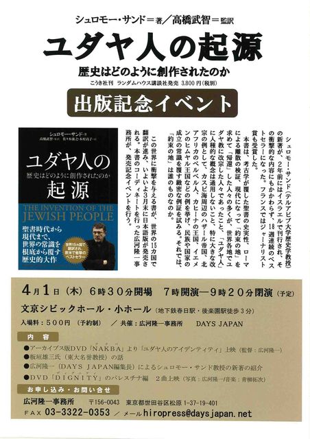 【予約締め切りのお知らせ】 4月1日「ユダヤ人の起源」出版記念イベントは、 おかげさまで定員に達しましたので、 予約受付を終了させていただきます。 当日券のご用意もできませんので、ご了承くださいませ。 お申し込みいただいた皆様、ありがとうございます。 当日のお越しをお待ちしております! -------------------------------------------------------------------- DAYS JAPAN存続が決定し、 その報告がなされた文京シビックセンター 小ホールにて、 4月1日に広河事務所、DAYS JAPAN共催で絶対に見逃せな