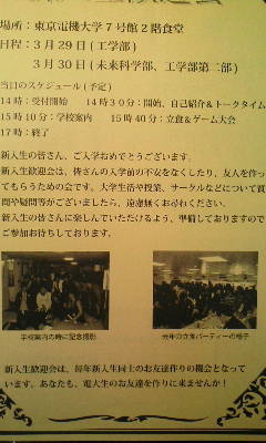 花見変更のお知らせ 先日MJ会花見についてご連絡しましたが、管理人、副管理人の都合により、変更をさせていただくことにしました。例年になく、参加人数も少ないため今年は取りやめとしたいと思います。 参加表明いただいたかた、またメッセージをくれた方は申し訳ありませんでした。後日、飲み会の企画も考えていますので、そちらへ参加してください。