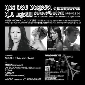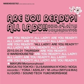ARE YOU READY?! ALL LADY!! 4月1日(木)@WAREHOUSE702 OPEN 22:00 DOOR ¥3000/1d W/F ¥2500/1d ベテランWOMAN DJS、ここに集結!!!!!!!!!アグレッシブなテックサウンドからエモーショナルでハウシーなトラックまで、国内TOPクラスに君臨するMAYURIを中心に、WOMAN DJSならではの感性豊かな様々なエレメントがWAREHOUSE702を包み込む! <GUEST DJ> MAYURI(Metamorphose) <DJ> MOCA(702 TOKYO) DJ SAVANNA YONA ASHLAY M-other(MIYU&MAI) <VJ> GORO <SOUND TECH> YUKO MORISHIGE