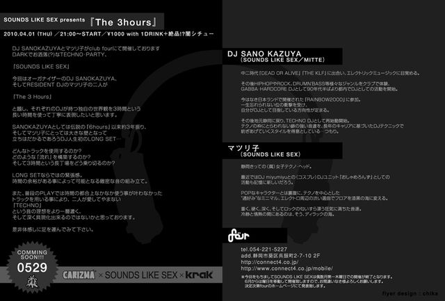 管理人様、 告知失礼致します。 -------------------------------------------- SOUNDS LIKE SEX presents 『The 3 Hours』 2010・4・1 (THU) 21:00〜START \1000 with 1DRINK+絶品!?闇シチュー DJs: SANO KAZUYA マツリ子 -------------------------------------------- DJ SANOKAZUYAとマツリ子がclub fourにて開催しておりますDARKでお洒落(?)なTECHNO・PARTY、 『SOUNDS LIKE SEX』 今回はオーガナイザーのDJ SANOKAZUYA、 そしてRESIDENT DJのマツリ子の二人が 『The 3 Hours』 と題し、 それぞ
