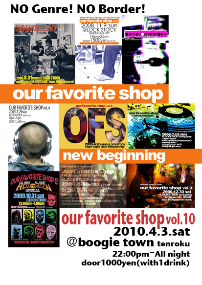 この春、装いも新たに新しい場所で仕切り直し!! OUR FAVORITE SHOP VOL.10 4月3日(土)22:00~All NIght @Boogie Town(天神橋筋六丁目、天六交差点のやよい軒の2F) こんなお店→http://www.hotpepper.jp/strJ000759580/ door:FREEEEEEE!!(1drink¥500) 出演 DJ MOOK/DJ AKIYOSHI(from GLISTER) /DJ MATAIRA /DJ TETSU 中山あや/JUNKSHOCK/mr.samohang VJ GHOSTDOGS 「気の向くまま、自由に、おのおのがお気に入りを集めて 組み立てるパーティー空間」として2008年8月よりスタート。 アメリカ村 BAR LOCKSTO