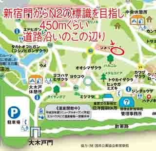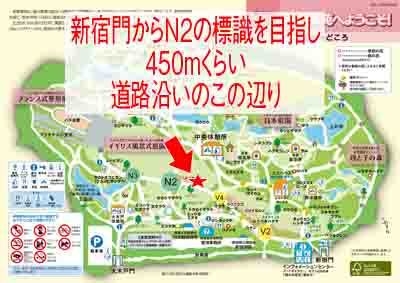 花見の場所 +++++++++++++ ★新宿門からイギリス風景式庭園の方の「N2」の標識を目指して450mくらいの場所です。わかりやすいように道路沿いを陣取る予定です。 ★黄色いガムテープで縁取りをしたブルーシートで陣取ってます。それが目印ってことで。 ■でっかい地図版 http://trs.jpn.org/100403_hanami/100403_hanami_large.jpg ■ちっちゃい地図版 http://trs.jpn.org/100403_hanami/100403_hanami_small.jpg 道路沿いの、桜の並木の端(チョット日陰をとれるくらい)辺りを狙っていきます。 +++++++++++++++++++++++++++++
