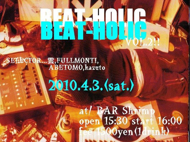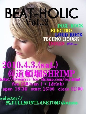 はい、おまんたせ致しました。 第二段告知です!! ★BEAT-HOLIC.vol.2★ 2010.4.3.(sat.) @道頓堀シュリンプ 会場:Live Space BAR SHRIMP(道頓堀シュリンプ) ※住所:大阪府大阪市中央区西心斎橋2-4-7 新福二ビルB1(※入り口は1Fになります) アクセス↓ 地下鉄難波駅・近鉄難波駅・地下鉄心斎橋駅 から徒歩5分程度。 スポタカの角(交差点名『道頓堀橋北詰』)を 曲がるとSHRIMPの赤い看板が見えます。 ※ホームページ:http://livespace-bar-shrimp.com/top.html open 15:30 start 16:0