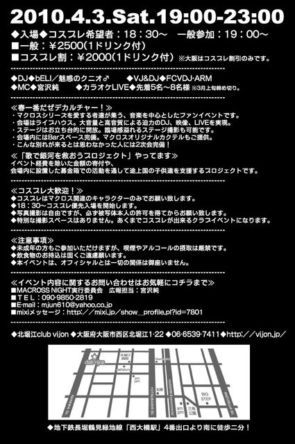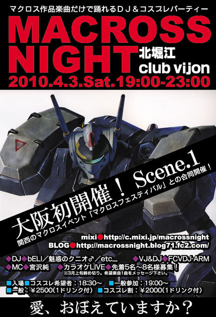 マクロス作品と音楽をこよなく愛してやまない人へ贈る、 マクロスシリーズの全てを網羅した作品音楽の祭典が関西初上陸! 昨年から東京で始まったマクロスナイトがいよいよ大阪にやってきた! 右も左もマクロス三昧!クラブイベント初心者さんも楽しめる、 アットホームなパーティーです! もちろん東京からの遠征さんも大歓迎! ☆☆☆☆☆☆☆☆☆☆☆☆☆☆☆☆☆☆☆☆☆☆☆☆☆☆☆☆☆☆ ≪MACROSS NIGHT 大阪春の陣 vol.1≫ ◆日程◆2010年4月3日(土) 18:30〜23:00 ◆入場◆コスプレ希望者:18:30〜 一般参