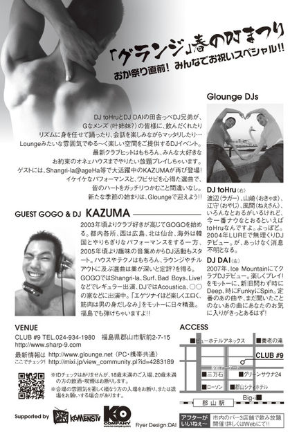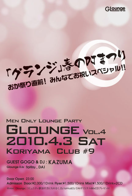 『グランジ』春のDJまつり おか祭り直前!みんなでお祝いスペシャル!! DJ toHruとDJ DAIの田舎っぺDJ兄弟が、Gなメンズ(叶姉妹?)の皆様に、飲んだくれたり、リズムに身を任せて踊ったり、会話を楽しみながらマッタリしたり… Loungeみたいな雰囲気でゆる〜く楽しい空間をご提供するDJイベント。 最新クラブヒットはもちろん、みんな大好きなお約束オネェハウスまでやりたい放題プレイしちゃいます。 ゲストには、Shangri-la@ageHa等で大活躍中のKAZUMAが再び登場! イケイケなパフォーマンスと、ワビサビを心得た選曲で、皆のハートを