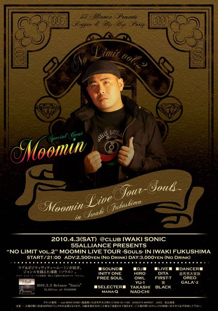 ※管理人様告知失礼いたします。 55 ALLIANCE presents NO LIMIT Vol.2 MOOMIN LIVE TOUR 『SOULS』 IN 福島 2010.4.3(sat)@SONIC OPEN 21:00〜 adv \2500(NO DRINK) door \3000(NO DRINK) ■SPECIAL GUEST■ Moomin ■GUEST DJ■ MISTA-SHAR ■SOUND■ INITY ONE FREE SOUL ■SELECTER■ mana-Q ■LIVE■ DITA FIRST-T 零 BLACK ■DJ■ HIRO OWL YU-1 TAKASHI NAO-CHI ■DANCER■ 益荒男大家族 OREO GALA'-z ■VJ■ KOOL ■Moomin Profile■ 「