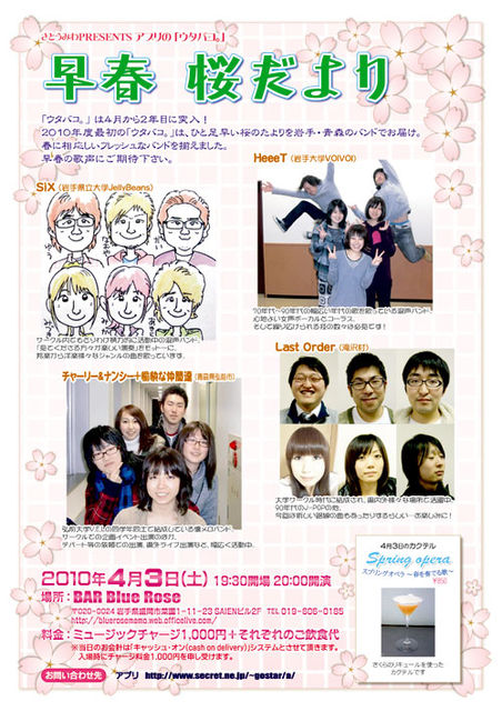 盛岡市のライブバーで定期開催しているアカペラライブ 「ウタバコ。」は4月よりリニューアル致します。 下記の日程で開催する運びとなりましたので、 皆様お誘い合わせの上ご来場下さい。 お待ちしております。 アプリの「ウタバコ。」 -早春 桜だより- 日時:2010年4月3日(土) 19:30開場 20:00開演 場所:岩手県盛岡市菜園/BAR Blue Rose http://bluerosemamo.web.officelive.com/ 料金:ミュージックチャージ1,000円+それぞれのご飲食代 ※当日のお会計は「キャッシュ・オン(cash on delivery)」システムとさせて頂きます。 入場