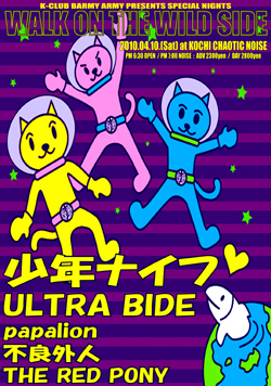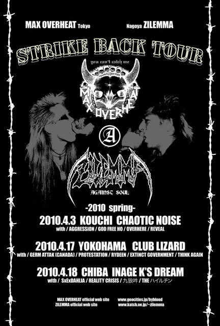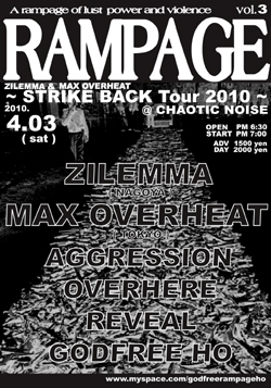 ★今週末一本目04月3日(土)は、CONGA FURYのベーシストとして活躍する白石リーダー率いる"GODFREE HO"プレゼンツ「RAMPAGE Vol.3」!! 今回は東京よりMAD MAX臭を放つモーターロケンローHcバンド"MAX OVERHEAT"が高知初上陸!!! 詳細はこちら↓ ● 04月3日(土) "GODFREE HO" Presents [ RAMPAGE Vol.3 ] PM 6:30 OPEN / PM 7:00 NOISE : ADV 1500円 / DAY 2000円 Feat : MAX OVERHEAT(東京) / AGGRESSION / GODFREE HO / OVERHERE / REVEAL MAX OVERHEAT : http://www.geocities.jp/hyblood/top.html ★続く二本目、04月04日(日)は高知のバ