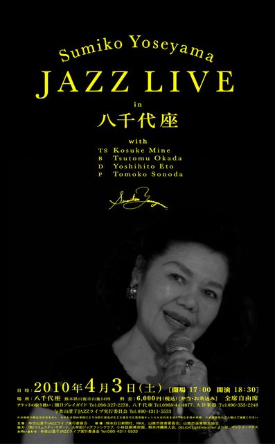 4月3日・熊本県山鹿市の八千代座で、沖縄のビリー・ホリディと称される ジャズヴォーカリスト、与世山澄子さんのJAZZライブを開催します。 沖縄のジャズシンガー「与世山澄子JAZZライブin八千代座」 【開催概要】 ■公演名 「与世山澄子JAZZライブin八千代座」 ■出演 与世山澄子(vo)with 岡田勉(b)峰厚介(ts)江藤良人(ds)園田智子(p) ■日時 2010年4月3日(土) 17:00開場 18時30分開演 ■場所 八千代座 熊本県山鹿市山鹿1499 ■チケット 全席自由 6,000円(弁当・お茶込み) 好評