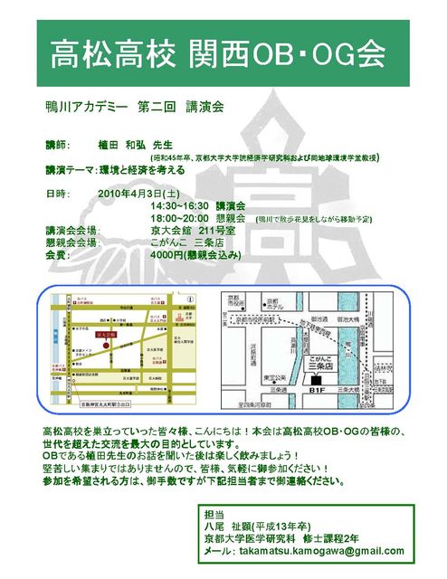 みなさん、はじめまして。 平成13年卒の八尾祉顕と申します。 http://mixi.jp/show_profile.pl?id=1563041 このたび、関西の高高卒業生のつながりをもっと深めていこうということで「第二回鴨川アカデミー」と題した、講演会・飲み会を開催します。 おかげさまで、去年開催した第一回は素晴らしい会となりました! 非常に幅広い層の方々に参加していただき、とてもよい交流が出来たと思います。(写真参照) さて今回は前にも増して、偉大な先輩方に多数参加していただけそうです。 このつながりを放って置くのはもったいない!! というわ