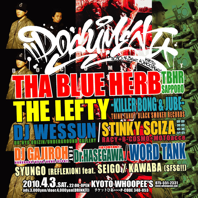 2010.4.3.sat "DOCUMENT" @KYOTO WHOOPEE'S 075-551-2331 www.whoopees.net OPEN-22:00 ADV.3,000YEN DOOR.4,000YEN ★★★ LIVE ★★★ ■THA BLUE HERB -TBHR- ■THE LEFTY (KILLER BONG &JUBE) -THINK TANK/BLACK SMOKER RECORDS- ■STINKY SCIZA (RACY&B-COSMO&MOTOacce) -BONG BROS- ■WORD TANK ★★★ DJ ★★★ ■WESSUN -DO-HYO ORIZIN- ■DJ GAJIROH fet.Dr.HASEGAWA ■GAJIROH -BONG BROS/KCYB- ■SYUNGO -REFLEXION- feat.SEIGO ■KAWABA -SO FAR SO GOOD!!- ------ TICKET INFO ------ ■チケットぴあ