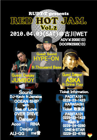 4月3日(土) RED HOT JAM @古川 Wet 【Guest Selecter】 Hype-On from Thousand Base 【Guest Deejay】 Jumboy 【Guest Dancer】 Aska from Green Pixi 【Sound】 DJ-Keven from Jamaica Ocean Ship with Sound System Over Drive 【Deejay】 Ari-gg Me音 【Dancer】 Rina Akko ADV \2000.1D DOOR \2500.1D チケット、場所等のお問い合わせ受付ております
