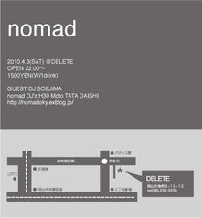 管理人様告知失礼致します。 NOMAD 3rd 2010 . 4 . 3 ( sat ) PLACE : @ DELETE TICKET : 1500YEN( w/1drink ) OPEN & START / 22 : 00 GUEST DJ soejima ( dynamo、Night Mare ) DEEJAYS tata、Moto、H3O、DIESHI 今回は岡山のテクノゴッド、soejimaさんをGUESTに招いてDEEPに奥深くへ。。 圧巻の2時間PLAYは必見です。 今回もメンバー制作のMIX-CDを用意して(先着順)お待ちしております。 TECHNOを軸にMINIMAL、TECH HOUSE、トライバルなど幅広くセレクトしていきます。 4月3日は是非表町DELETEにお越