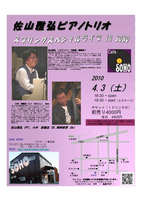 SOHOのオーナーでありドラマーの岡崎さんから スペシャルジャズライブお知らせです。 佐山雅弘(p) http://www.sayamamasahiro.com/ 小井政都志(b) http://www.jazz-naru.com/musicians/koimasatoshi.html 岡崎章男(ds) とき:4月3日(土)18:30 Open、19:30 〜 Start( 2Stages) チケット:前売り4,000円 / 当日 4,500円 (1ドリンク付き) SOHOにて前売り受付中(TEL・MailまたはSOHO現地にて) 場所:Cafe SOHO http://soho214.blog11.fc2.com/ 岡山市北区今4−4−
