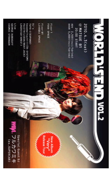 管理人様失礼します。 告知させて下さい。 WORLS END Vol.2 ■日時 ●2010/4/3(土) ■場所 ●松江B1 ■時間 ●PM8:00スタート ■ゲストDJ ●フルカワミキ(ex.SUPERCAR) ■DJ ●FUJITA(JIEDA/BEATJACK) ●kaaamaitachiii(3D-SYSTEM) ●TUYO―C(EXPAND) ●LOGOS(GO!ARES!) ■BAND ●GEORGES DUBOEUFF ●COSMIC STRANGER ■チケット料金 ●ADV\2500 ●DOOR\3000 ●共に1D付き ●フルカワミキ(ex.SUPERCAR)プロフィール 1995 年、本人のバンド募集