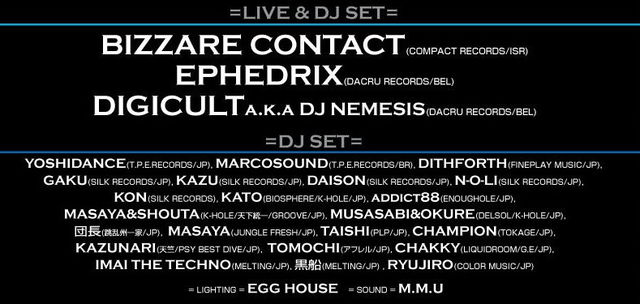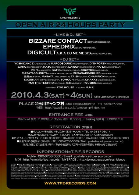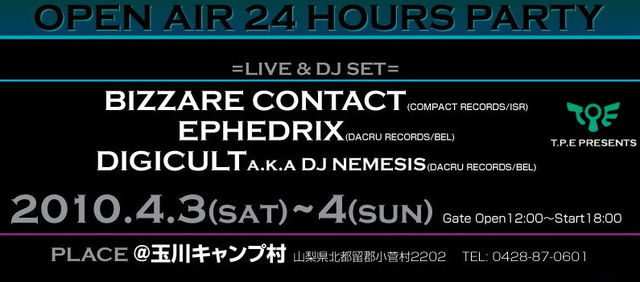 T.P.E PRESENTS OPEN AIR 24 HOURS PARTY 2010.4.3(sat)~4(sun) ◎Gate Open/PM:12:00~ ◎Start/PM:18:00~ @玉川キャンプ村(山梨県) =LIVE & DJ SET= BIZZARE CONTACT(COMPACT RECORDS/ISR) EPHEDRIX(DACRU RECORDS/BEL) DIGICULT a.k.a DJ NEMESIS(DACRU RECORDS/BEL) =DJ SET= YOSHIDANCE(T.P.E.RECORDS/JP) MARCOSOUND(T.P.E.RECORDS/BR) DITHFORTH(FINEPLAY MUSIC/JP) GAKU(SILK RECORDS/JP) KAZU(SILK RECORDS/JP) DAISON(SILK RECORDS/JP) N-O-LI(SILK RECORDS/JP) KON(SILK RECORDS) KATO(BIOSPHERE/K