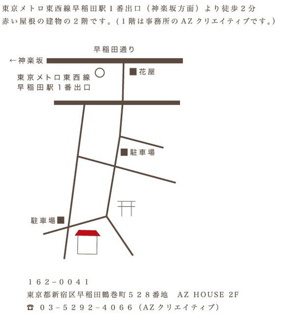 イメージ左: 個人セッション開催場所地図 イメージ中: ワークショップ開催場所 イメージ右: ワークショップ会場地図 告知: 個人セッション開催場所とワークショップ予定 リーディングセッションの場所を友人の経営する喫茶店で新たに始める事が 出来ました。東西線早稲田駅1番出口から徒歩5分の所にある道端カフェ 「あかずの間」です。シンガーソングライターのるりさんが昨年秋ごろから 喫茶店をはじめまして、先日すこし遅めの開店祝いに行ってきました。 ★個人セッション(2010年3月15日から) 今月から、僕のアカ