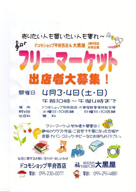 甲府の駿台・工業高校の西側にあるドコモ西店・大黒屋駐車場でフリーマーケットを開催するそうです 日時は4月3,4日 出店料は無料 今回初めてのイベントです まだブースが多少開いていると言うことです