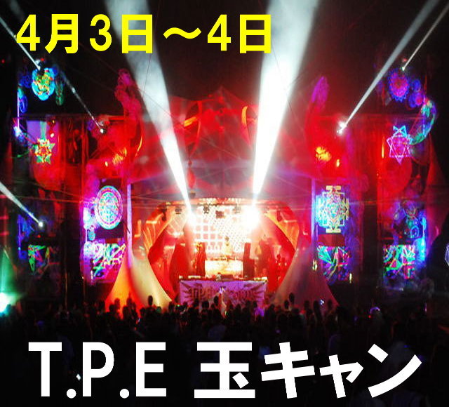 4月3日〜4日 T.P.E PRESENTS OPEN AIR 24 HOURS PARTY お得なディスカウント登録受付中です 登録は無料で1000円引きになるので お気軽に代表者名と人数を連絡ください 4.3(sat)~4(sun) Gate Open/PM:12:00~ Start/PM:18:00~ @玉川キャンプ村(山梨県) ※サマーランドの先 奥多摩湖を超えてすぐです =LIVE & DJ SET= BIZZARE CONTACT(COMPACT RECORDS/ISR) EPHEDRIX(DACRU RECORDS/BEL) DIGICULT a.k.a DJ NEMESIS(DACRU RECORDS/BEL) =DJ SET= YOSHIDANCE(T.P.E.REC