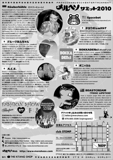 ★『メルヘソサミット2010』★ ☆4月5日(月) ☆OPEN/START PM18:00〜 ☆shinsaibasi Osaka@club STOMP http://club-stomp.com ☆前売り¥1500/当日¥2000(ドリンク代別) (フライヤー持参の方も前売り価格になります!) ★SPECIAL GUEST LIVE!!!!!★ ☆Räuberhöhle(ロイバーヒューレ)(from Berlin) http://www.rauberhohle.com http://www.myspace.com/raeuberhoehle ☆BEASTCREAM(toxic lipstick) http://www.myspace.com/toxiclipstick http://mixi.jp/view_community.pl?id=2391140 ★FASHION SHOW★ 日本のみなさん