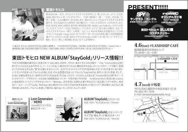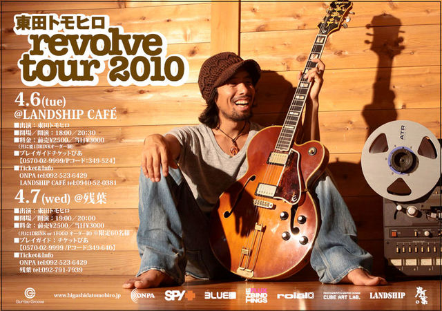 東田トモヒロ revolve tour 2010 全国30箇所!キャンピングカーでの音楽とヨコノリの旅 3/19〜4/11 海岸線を中心とした海側ツアースタート! 東田トモヒロの原点に回帰-revolve-した、ソロアコースティックライブで自身の音楽ルーツを見つめ直すレギュラーツアー。2010年は、キャンピングカーに、ギター、サーフボード、スノーボードを積み込み、よりシンプルなスタイルで行く先々の自然と人々と向き合っていきます。東田トモヒロのライフスタイルを昇華したこのライブツアーで、一緒に GOOD FUTUREを見つめましょう!! 福岡の詳細で