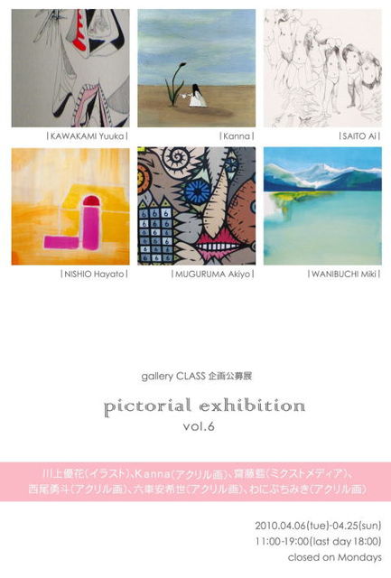 gallery CLASS 公募展 【pictorial exhibition Vol.6】 ◆会期:2009年4月6日(火)〜4月25日(日) ◆時間:11:00〜19:00(最終日は18:00まで) ※月曜休廊 ジャンルや技法・テーマを問わず、平面作品という枠組みだけに焦点を当てた gallery CLASS企画の公募展 「pictorial exhibition (ピクトリアルエキシビション)」。 今回は第六弾。 6人6様の世界をぜひご高覧ください。 ・参加作家:川上優花、Kanna、齋藤藍、西尾勇斗、六車安希世、わにぶちみき