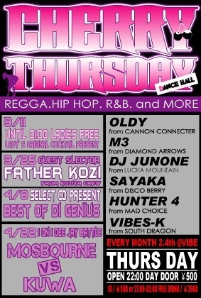 CHERRY THURSDAY EVERY MONTH 2・4 THURSDAY 2K10.04.08(THU) @VIBE OPEN/START 22:00〜 DAY/500 1D ORDER 22:00〜2:00 FREE DRINK/2000 ※SELECT CD PRESENT BEST OF DI GGENIUS RESIDENT SELECTOR OLDY fr.CANNON CONNECTER M3 fr.DIAMOND ARROWS DJ JUNONE fr.LUCKA MOUNTAIN HUNTER 4 fr. MAD CHOICE SAYAKA fr.DISCO BERRY VIBES-K fr.SOUTH DRAGON CHERRY SCHEDULE 4/22 1 ON 1 DEEJAY BATTLE MOSBOURNE VS KUWA