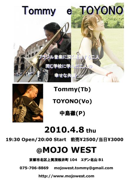 約一年ぶりの「Tommy e TOYONO」です! 「Tommy e TOYONO」 (e=ポルトガル語でand、です。) 出演: Tommy(Trombone) TOYONO(Vocal) 中島徹(Piano) open 19:00 start 20:00 前売2,500yen/当日3,000yen ■会場 京都北山mojo west http://www.mojowest.com/ 京都市北区上賀茂桜井町 104 エデン北山ビル地下1階 075-706-8869 かわいい後輩、TOYONOちゃん、そして同い年の中島徹、 いつも楽しいライブです。